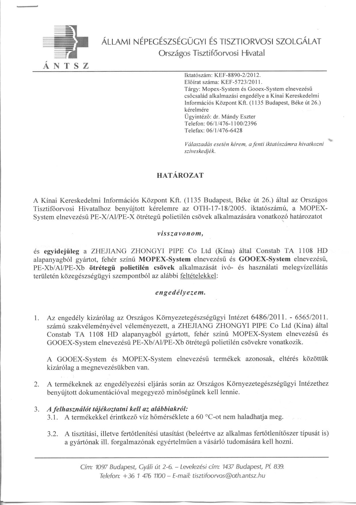 ANTSZ engedély: kef-8890-2/2012