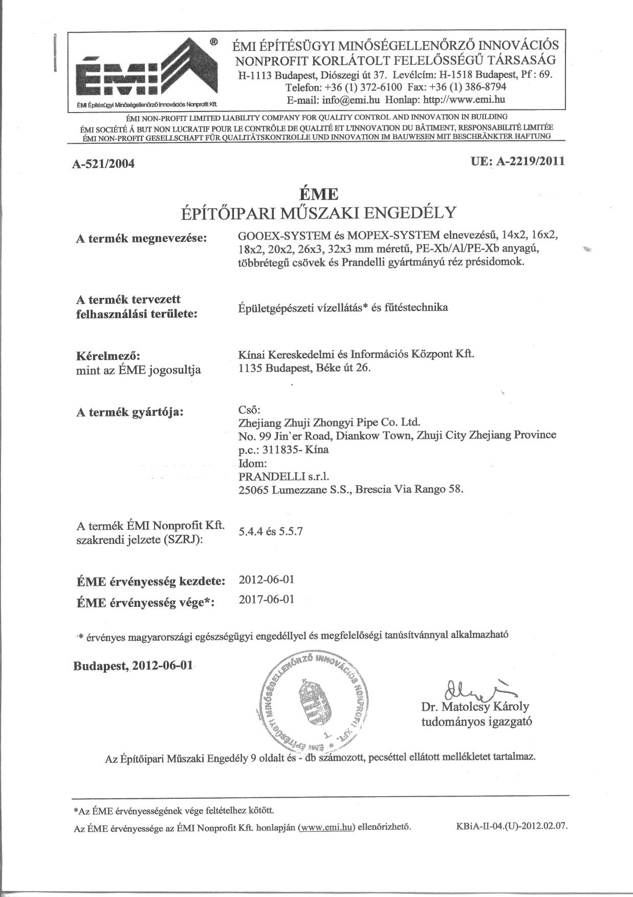 Építőipari Műszaki Engedély szám: A-2219/2011